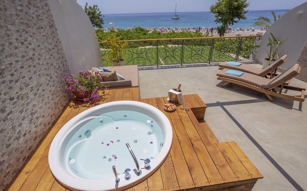 The Sea View Terrace Suite with an outdoor whirlpool and lounge area is perfect for relaxing any time of day or night. The terrace has views over the whole bay and beyond...