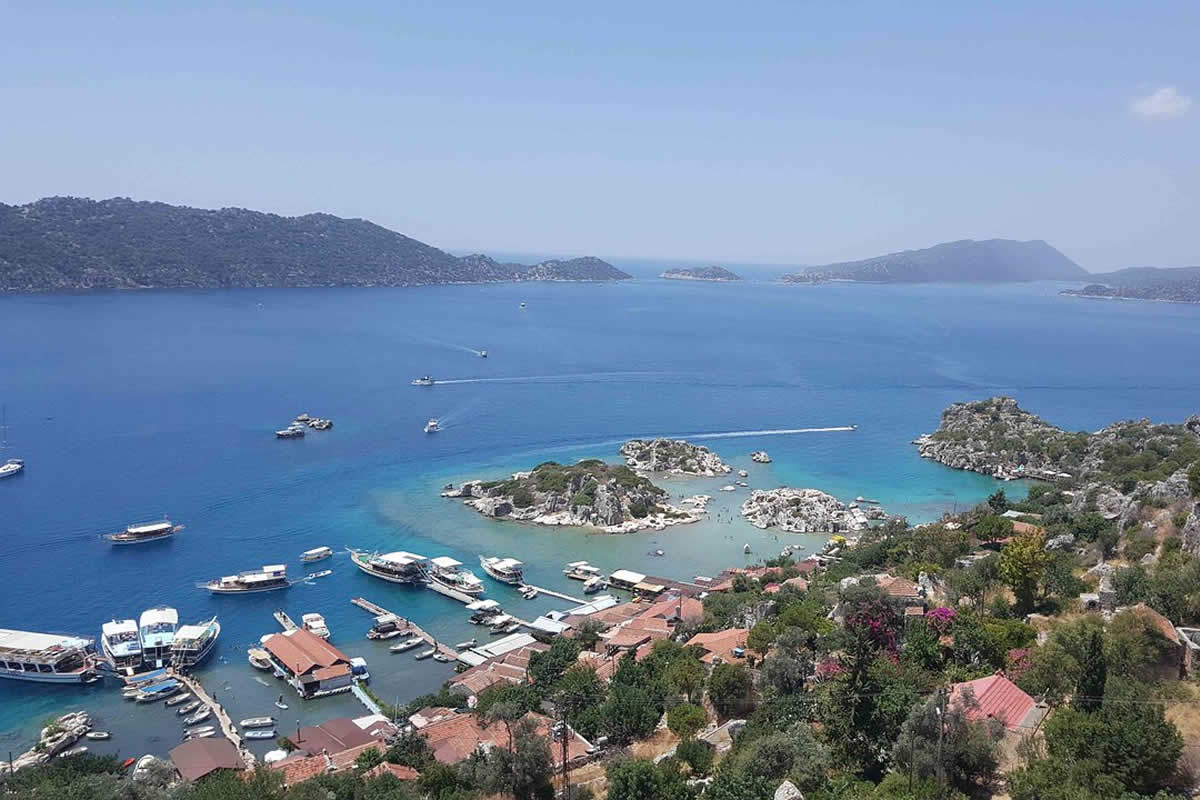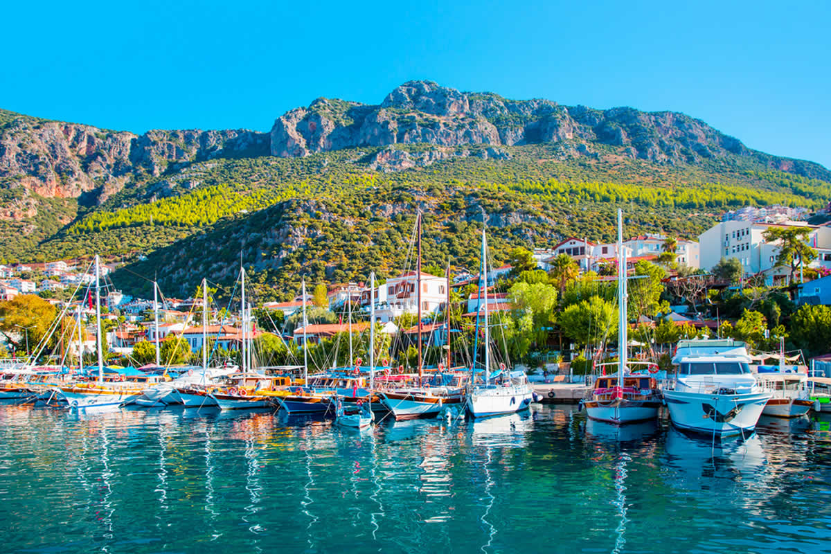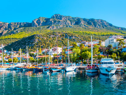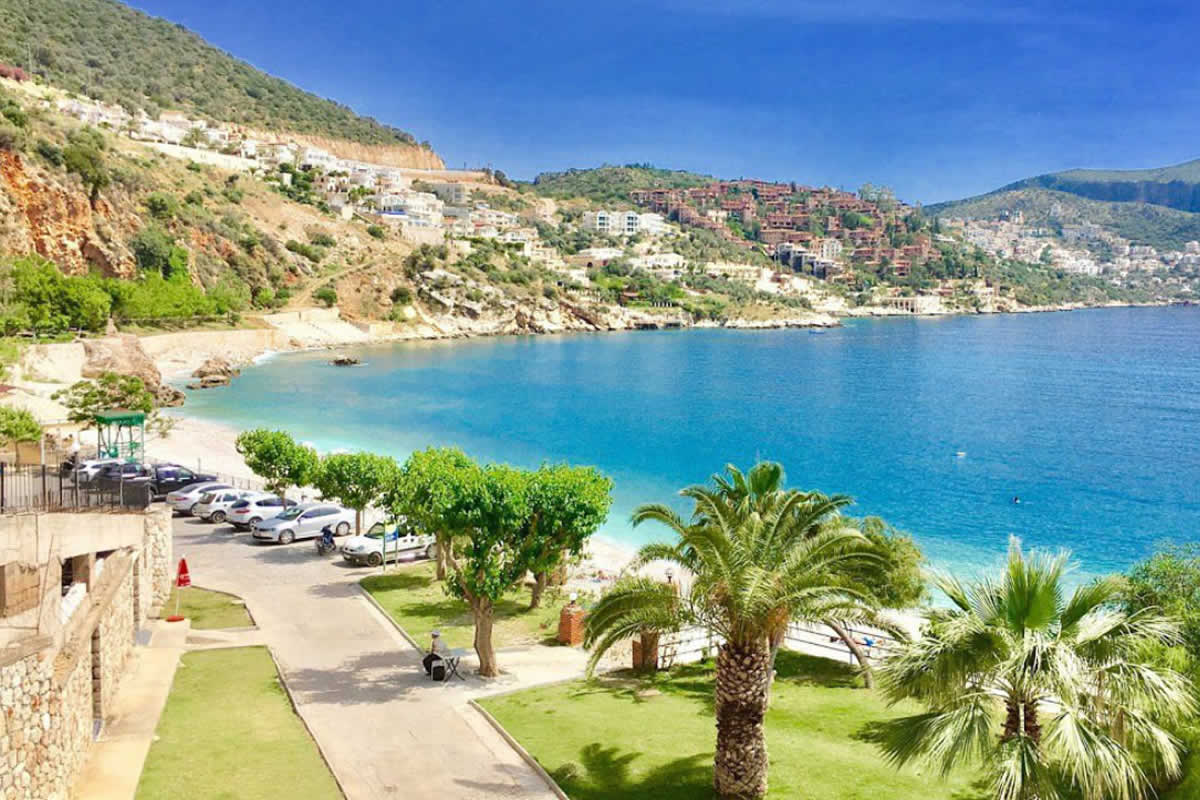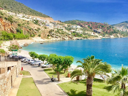 89Km. 1h 23min. Kalkan is an old fishing town, and the only safe harbour between Kaş and Fethiye; it is famous for its white-washed houses, descending to the sea, and its brightly coloured bougainvilleas. It averages 300 days of sunshine a year.