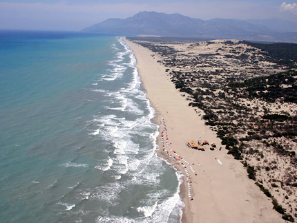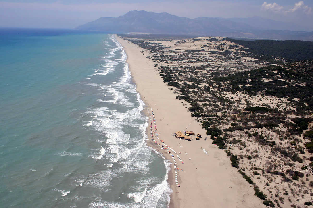 83Km. 1hr 23min. Patara Beach is a beach located near the ancient Lycian city of Patara in Turkey, on the coast of the Turkish Riviera.