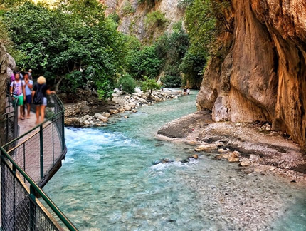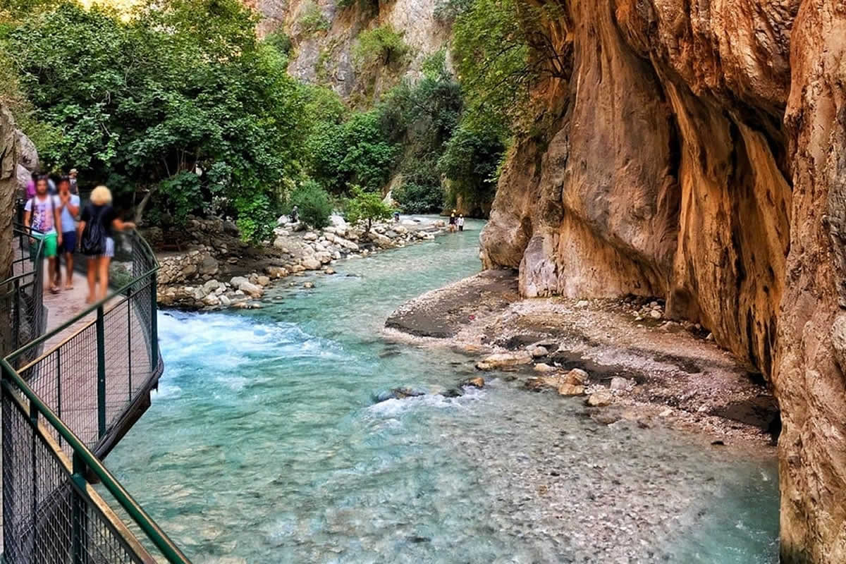 54Km. 1hr. Saklıkent National Park, established on June 6, 1996, is a national park in southwestern Turkey. The national park is a canyon, and is located in Muğla Province, 50 km far from Fethiye. Thé Canyon is 65 km from Kaş in the Antalya province. The canyon is 300 m deep and 18 km long, being one of the deepest in the world.