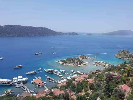 Üçağız by car 146km. 2hr 21min then boat. On its northern side there are the partly sunken ruins of Dolchiste/Dolikisthe, an ancient town which was destroyed by an earthquake during the 2nd century. Rebuilt and still flourishing during the Byzantine Empire period, it was finally abandoned because of Arab incursions. Tersane (meaning "dockyard", as its bay was the site of an ancient city Xera and dockyard, with the ruins of a Byzantine church) is at the northwest of the island.