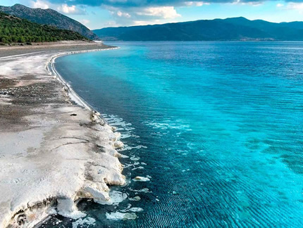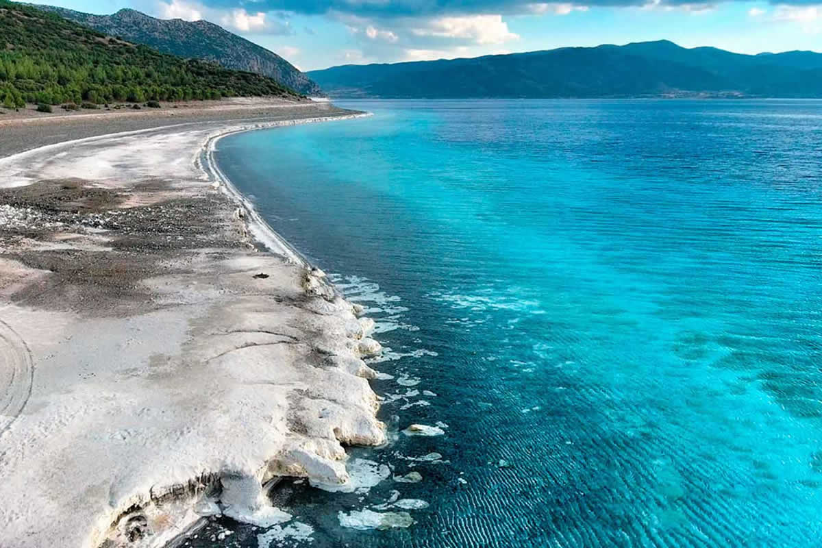 182Km. 2hrs 30min. Lake Salda is a mid-size crater lake[citation needed] in southwestern Turkey, within the boundaries of Yeşilova district of Burdur Province. It lies at a distance of about fifty kilometers to the west from the province seat Burdur. The lake is a popular excursion spot for people across the region or from beyond, the more so due to the hydromagnesite mineral found in its coastal waters, which is believed to offer remedies for certain dermatological diseases. The shorelines, surrounded by black pine forests, are also popular among hunters, the game and the fowl available including quails, hares, foxes, boars and wild ducks, aside from the lake's fish. White sandy beaches, limpid water and seven crystal-white islets within the lake complete the scenery.