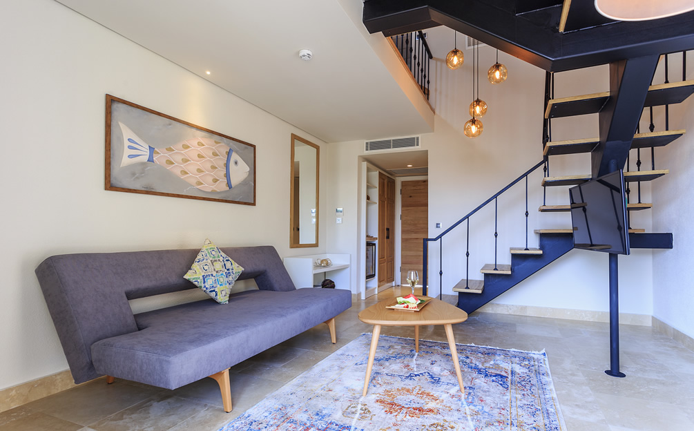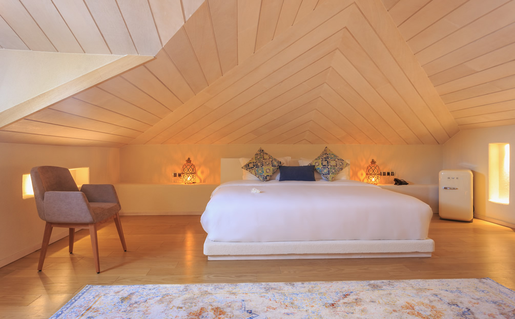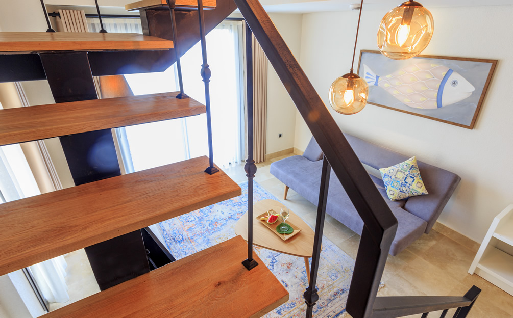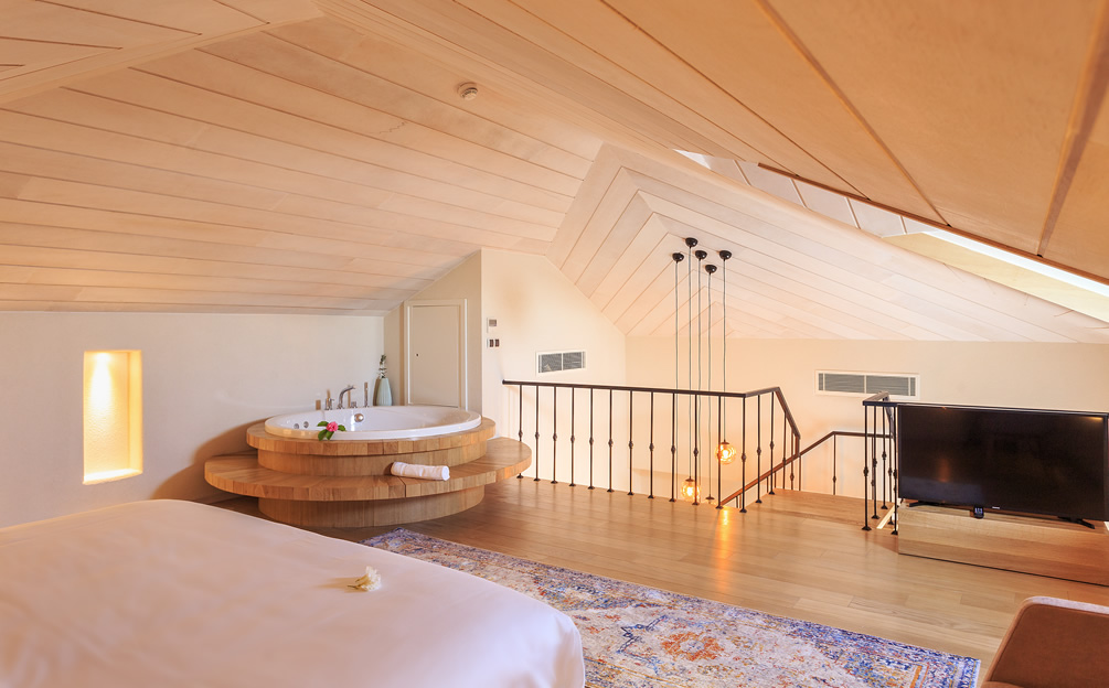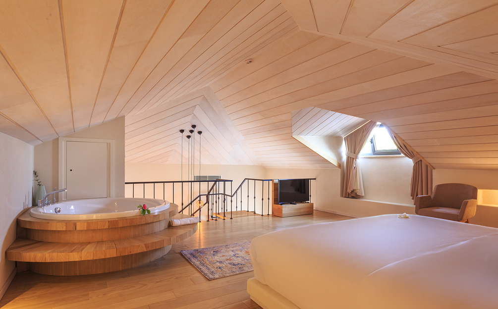 The four duplex Penthouse Suites are found on the upper floors. The entrance level features a spacious seating area opening onto a private balcony, offering spectacular views over the church courtyard. A modern internal staircase leads up to a private loft bedroom featuring a whirlpool bath. " Please Note… Due to the gallery style layout of the Penthouse Suites - they may not be suitable for guests with reduced mobility or disabilities"